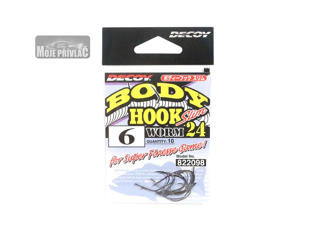 Ostré a pevné háčky Decoy 24 Body Hook udržují svým tvarem nástrahu pri přívlači na správném místě při vedení. Ideální háček pro přívlač se silikonovými červy, smáčky a jinými gumovými nástrahami. Použití háčků Decoy Worm 24 Body Hook je ideální s gumovými nástrahami bez zatížení, při nastražení uprostřed těla nástrahy nebo za hlavou. Díky velikostní řadě háčků umožňuje přívlač od malých dravců, až po ty největší. Antikorozní úprava jako by byla u háčků Decoy již samozřejmostí a tak nechybí ani u Decoy 24 Body Hook. Pro použití háčků s fluorocarbonem se doporučuje použití spíše silnějších průměrů. Decoy 24 Body Hook!!