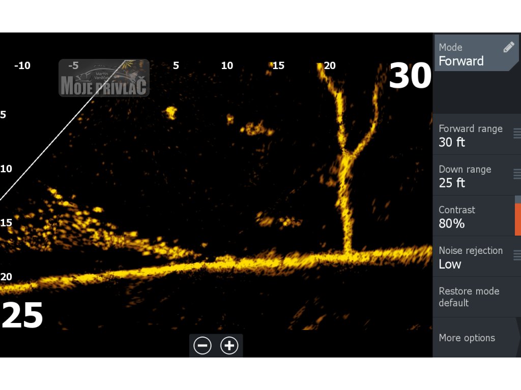 Zobrazuje struktury a rybí cíle, které se nacházejí před sondou.