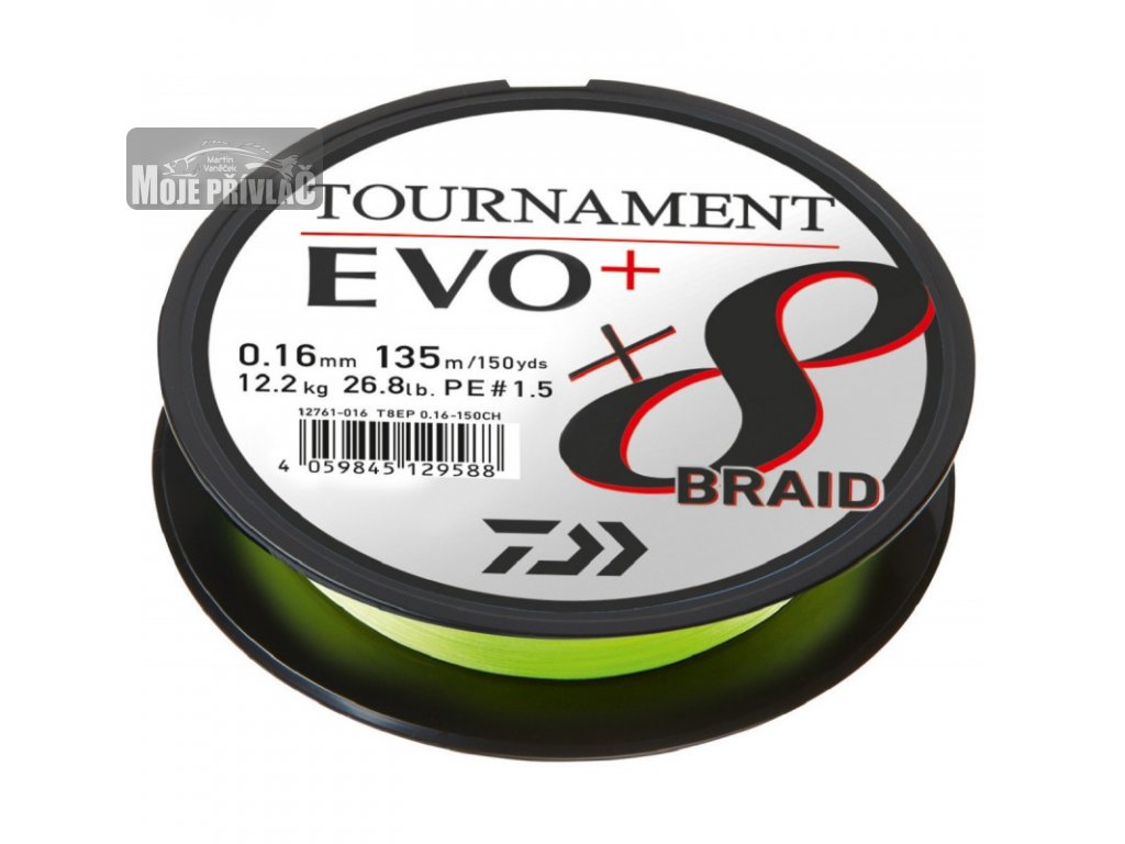 Dobře známá pletená šňůra Daiwa Tournament 8 byla ještě zdokonalena, a tak vznikla verze Evo+. Zejména povrchový potah byl vylepšen větším množstvím silikonu, což vede k menšímu tření během náhozu a delším hodům. Navíc je redukován zvuk vznikající při průchodu očky. Díky tomu je nová šňůra Tournament 8 Braid Evo+ technicky jednou ze světově nejlepších šňůr na trhu. Povrch verze Evo+ se netrhá a nepraská, a to ani při častém použití, a udržuje si kulatý profil. U nového obalu jsme také navíc snížili použití plastového materiálu o více než 50 %.
